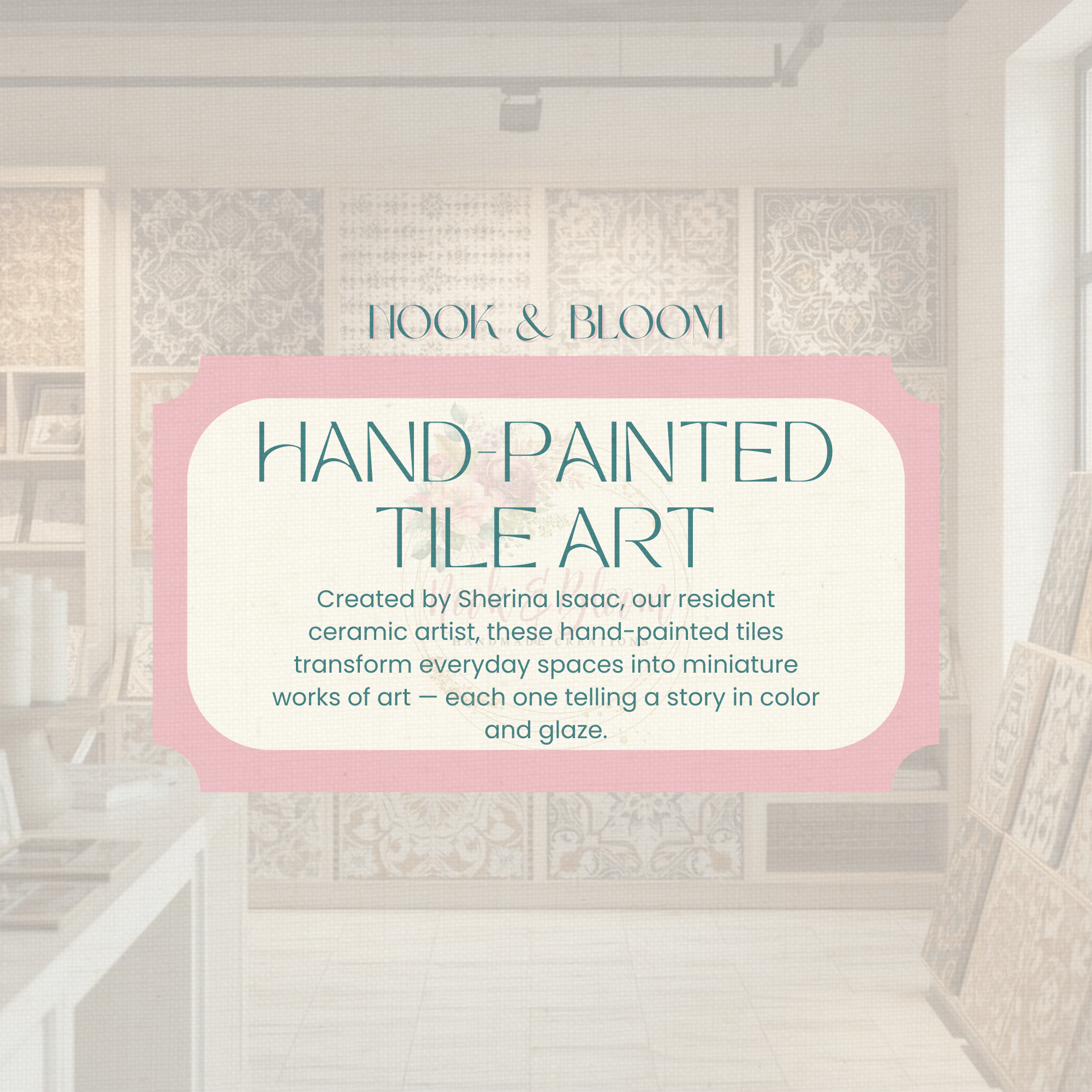 Inspired by the quiet poetry of the outdoors, this series captures flowers, leaves, and landscapes in acrylic and glaze. Each tile is painted freehand — a reminder that the most beautiful details are often found in imperfection.