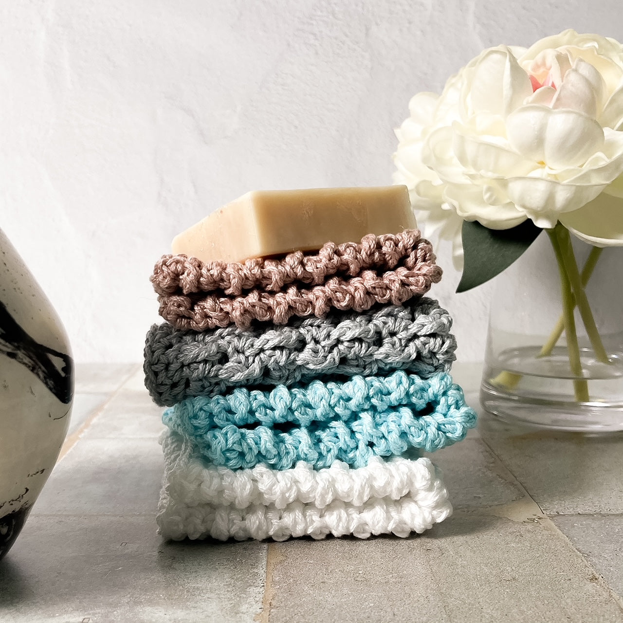 - Elegant Design: Each washcloth features a unique crochet pattern in a soothing color palette, including beechnut, white, light blue, and light grey.